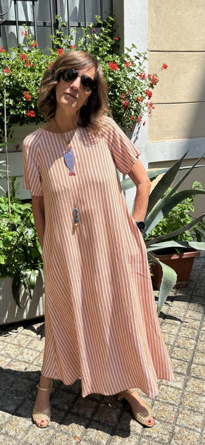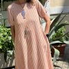 Abito lungo a righe, brand Niù , mezza manica leggermente svasato con ampie tasche in cucitura .