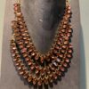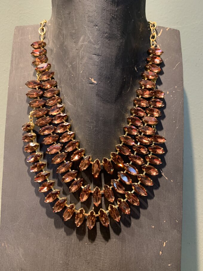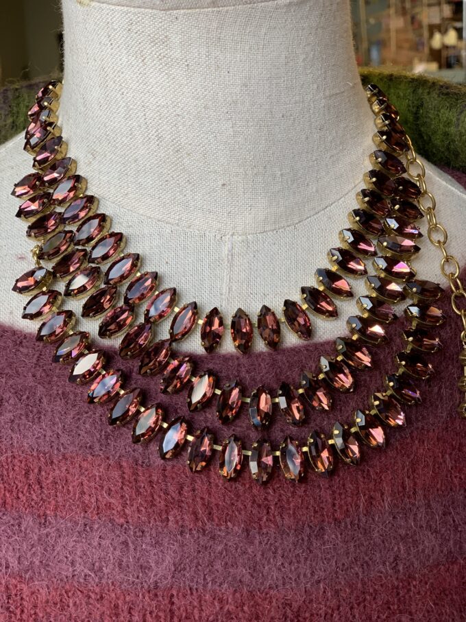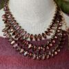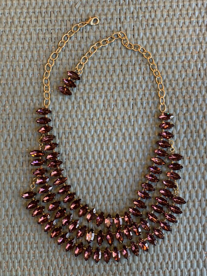 Collana girocollo regolabile a tre fili di cristalli burgundi montati su una base di ottone, anallergico e senza nikel.