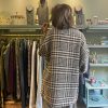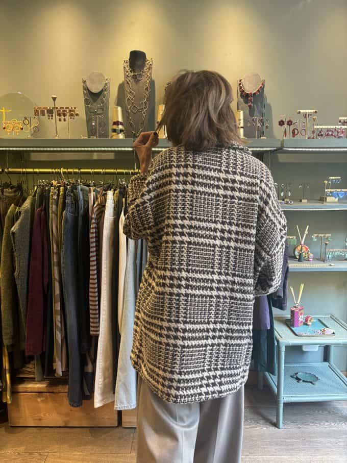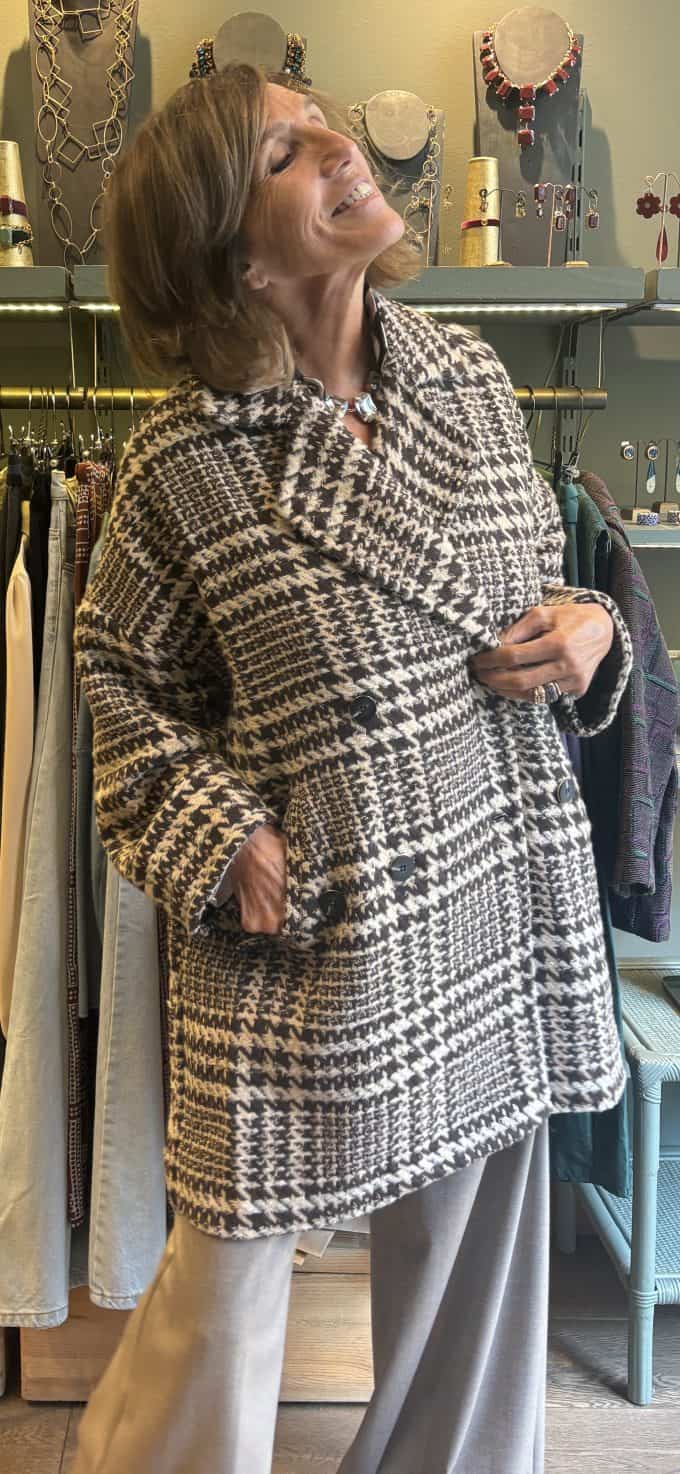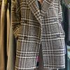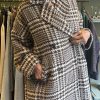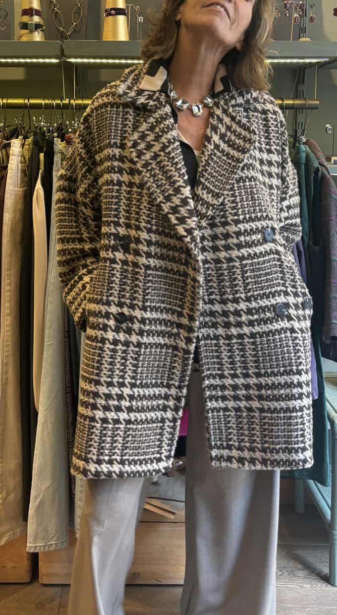 Cappotto doppiopetto 3/4 in tweed panna e marrone tasche a filetto con bottone.