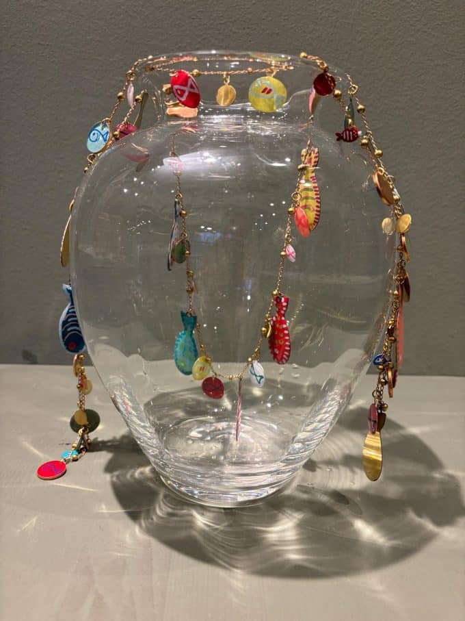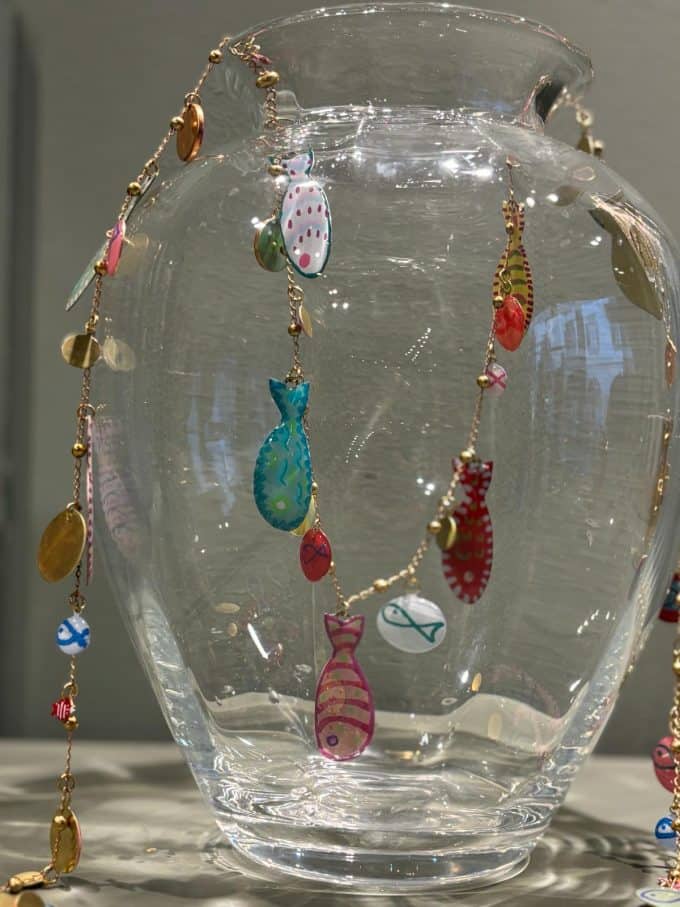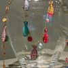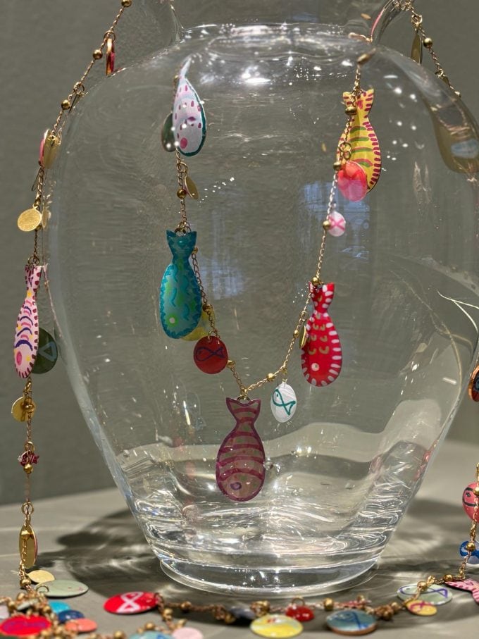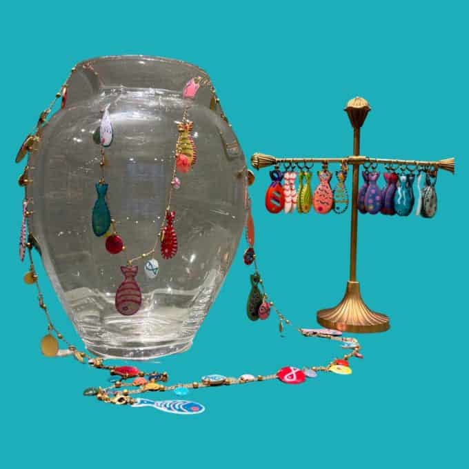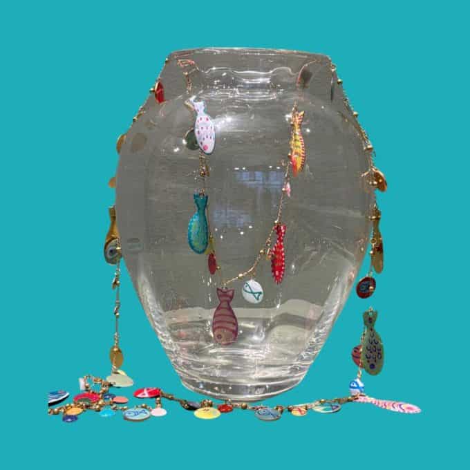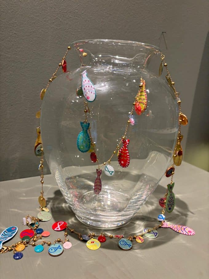 Collana lunga con catena in rame e ottone e pesci in resina dipinti a mano. Ogni pezzo è unico.