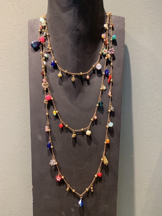 Collana lunghissima, si puo’ girare fino a 4 volte intorno al collo. La catena è in ottone arricchita da pendenti in cristallo, pietre dure, smalti, charms, murrine. Ogni Gipsy Mix è unica. A richiesta si può avere della lunghezza desiderata.