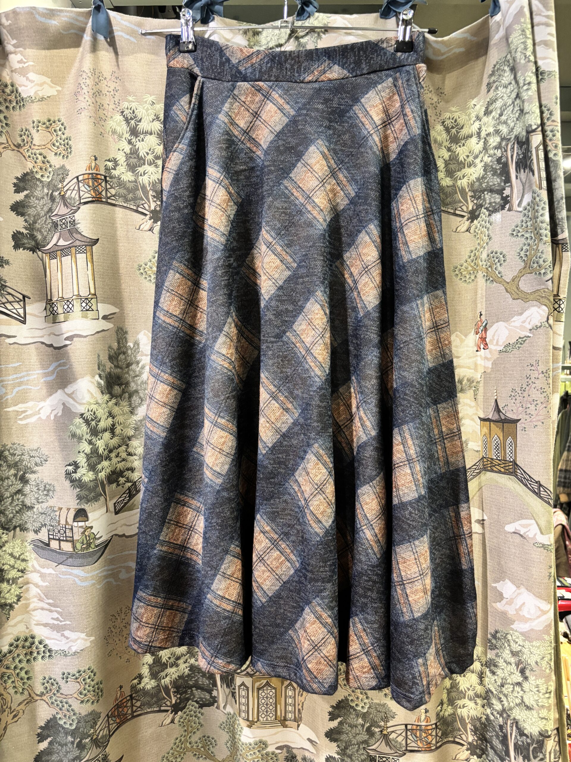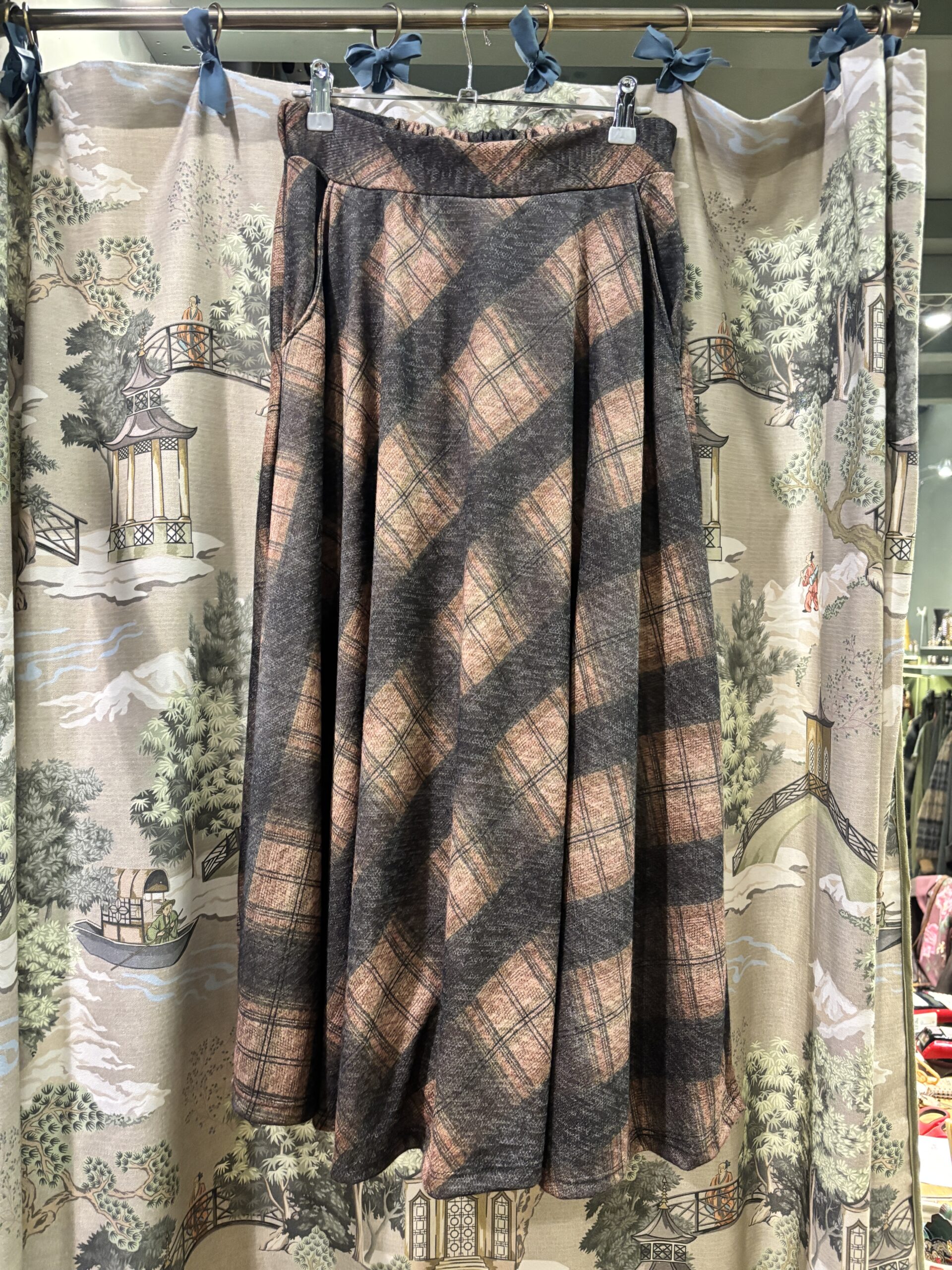 Gonna  scozzese midi taglio sbieco con ampie tasche , cinturino piatto davanti con elastico sul dietro  disponibile in 2 varianti.