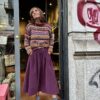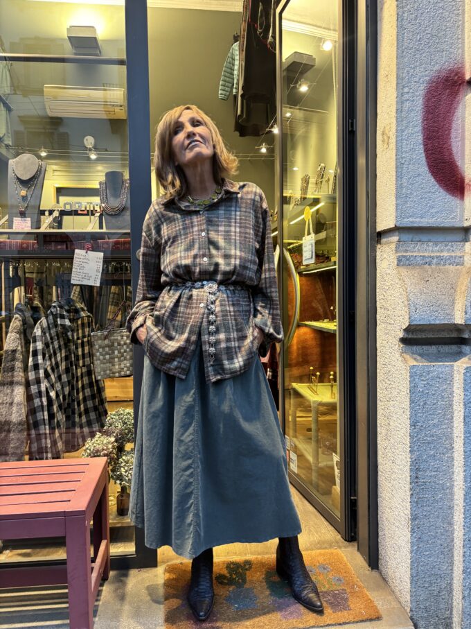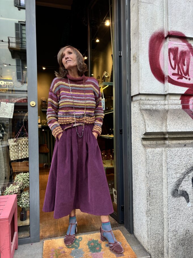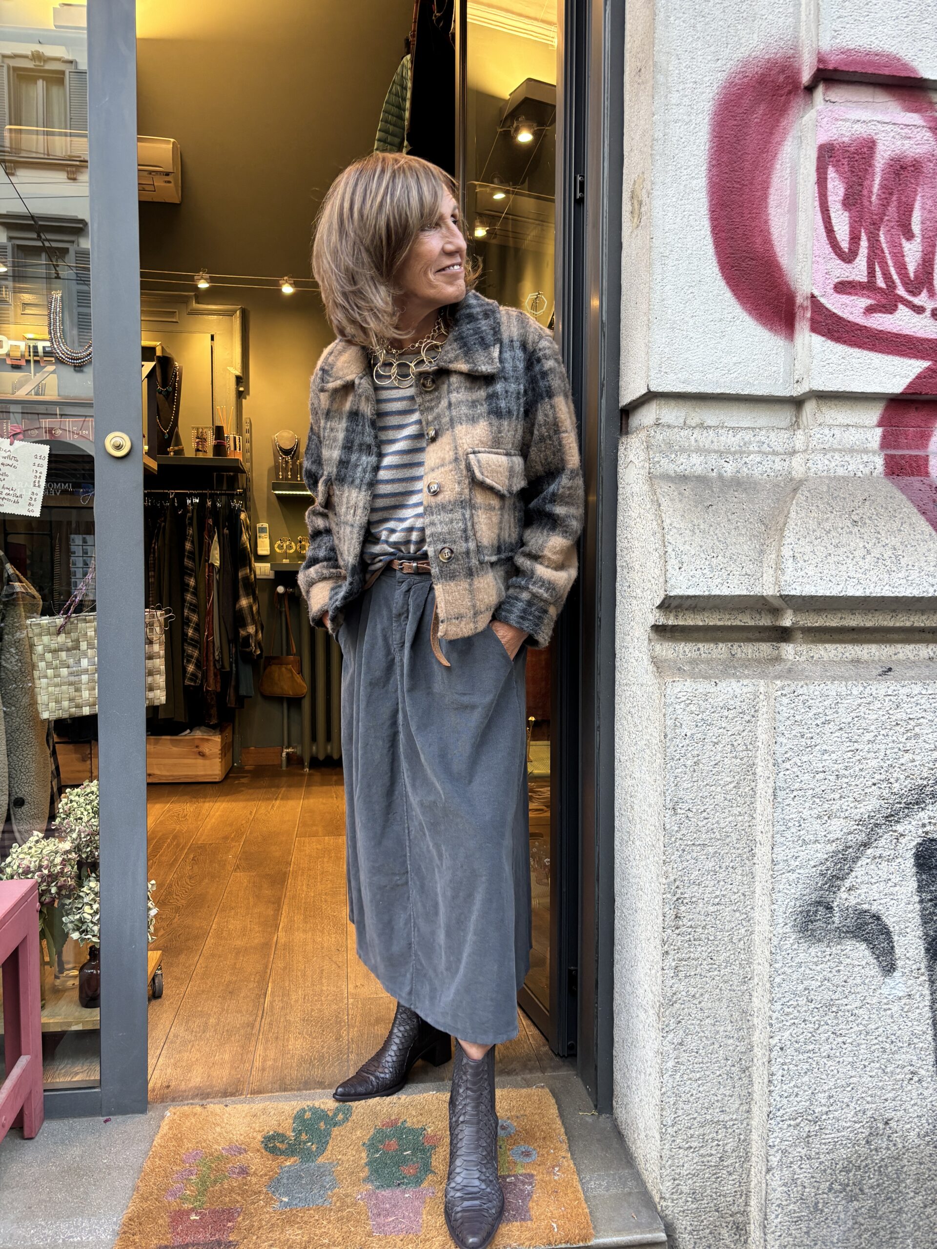 Gonna in velluto 2000 righe con cinturino e cerniera , 2 ampie tasche sui fianchi .