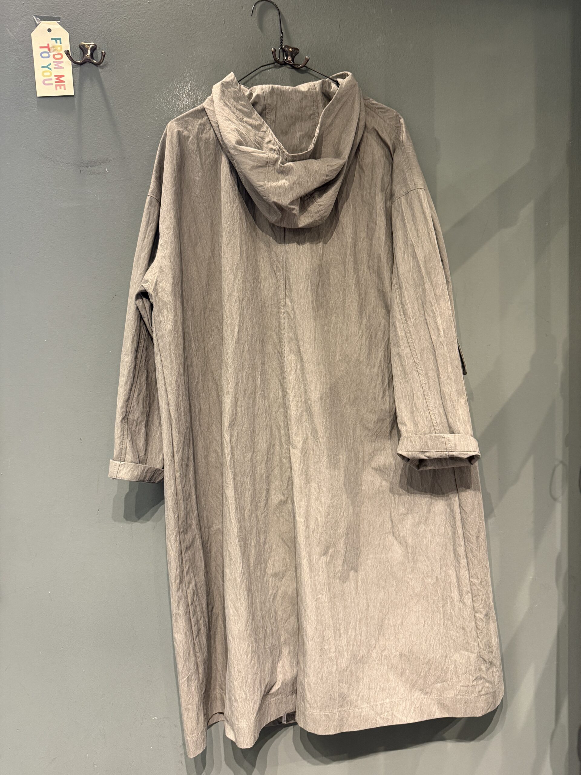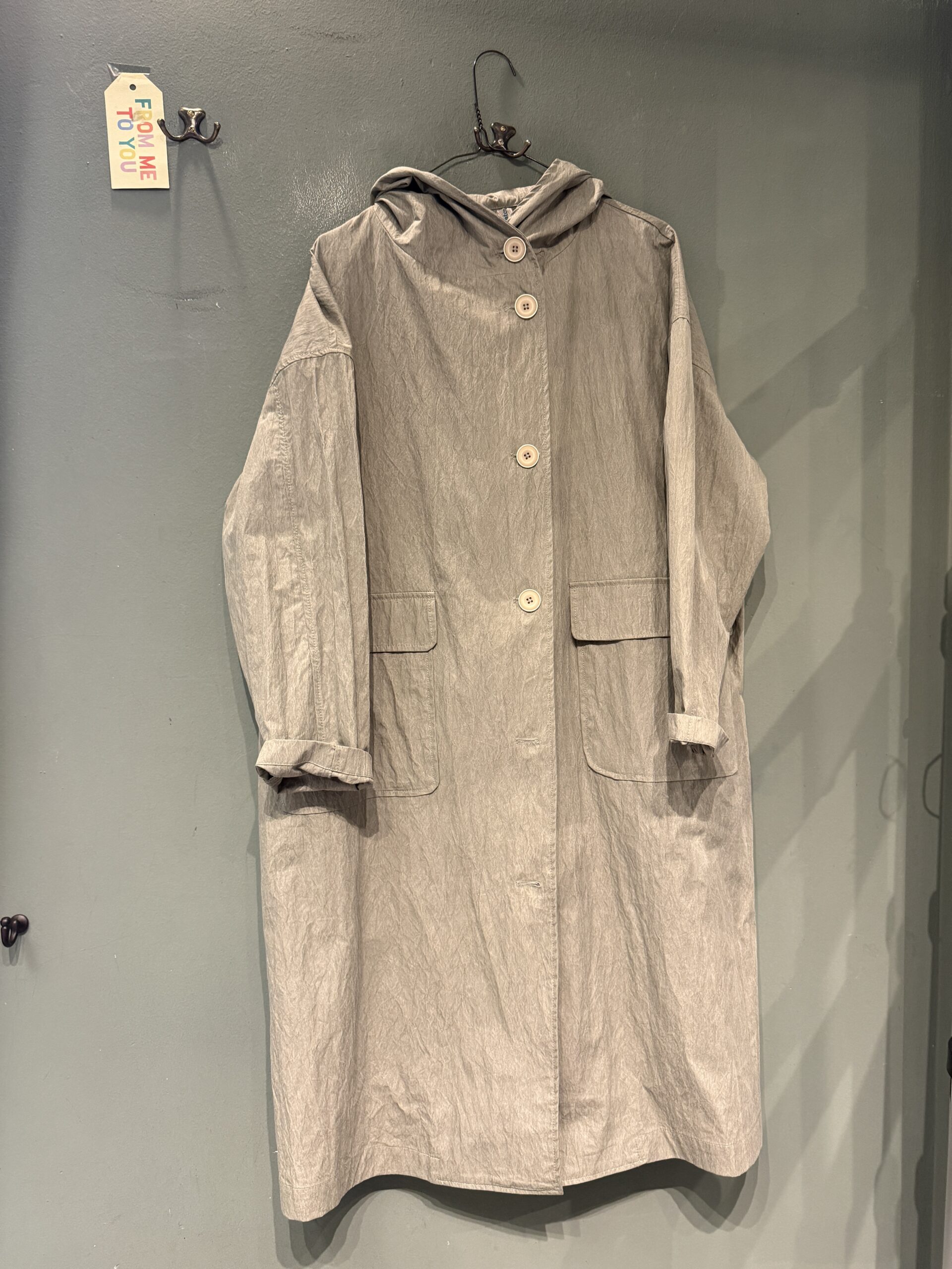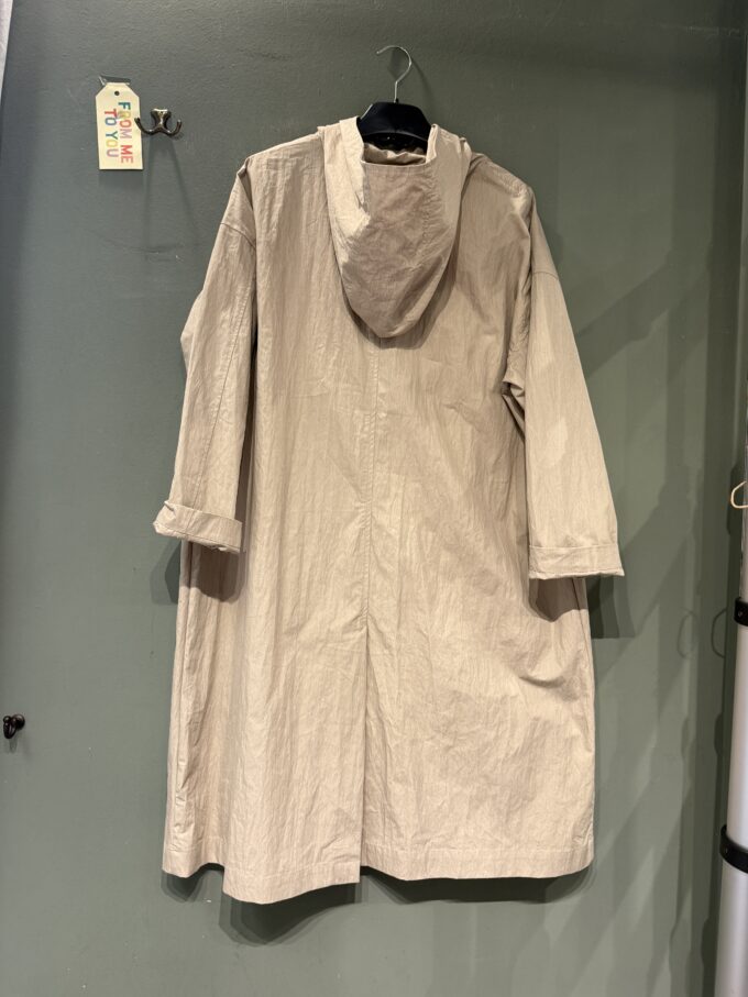Impermeabile con cappuccio aperto sul davanti con 6 bottoni e ampie tasche applicate con patella.