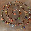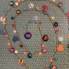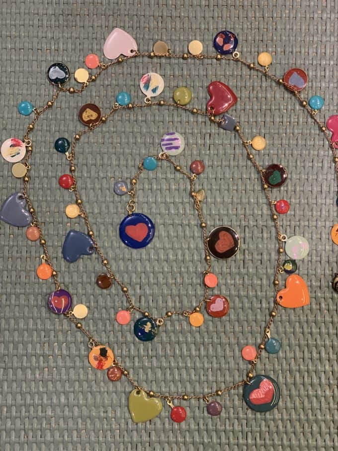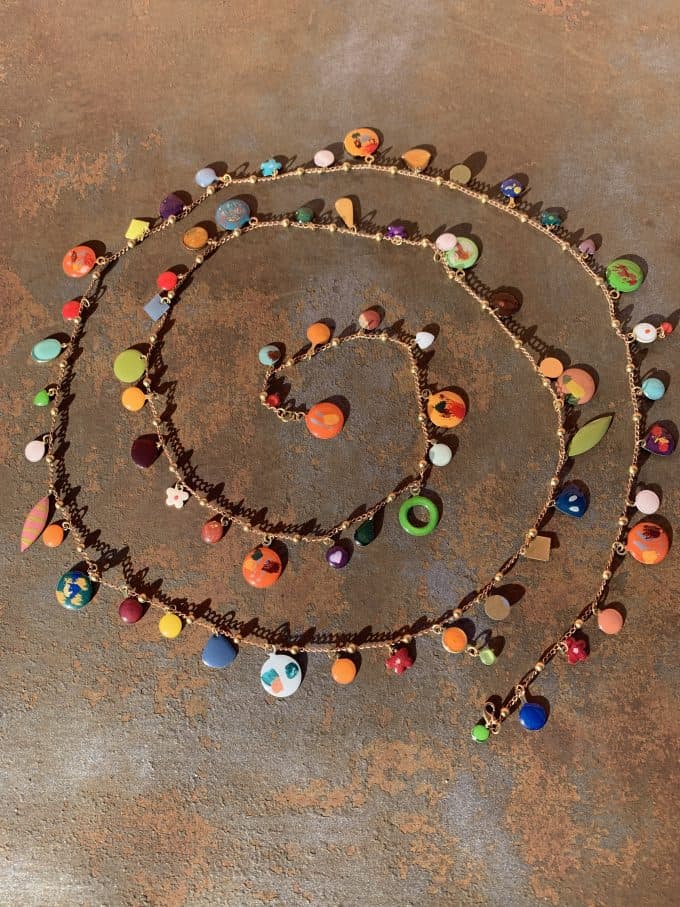 Collana in ottone e rame lunghissima con possibilita’ di girarla diverse volte. Ogni castoncino è in resina dipinto a mano.