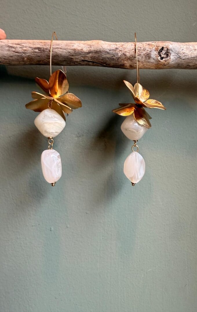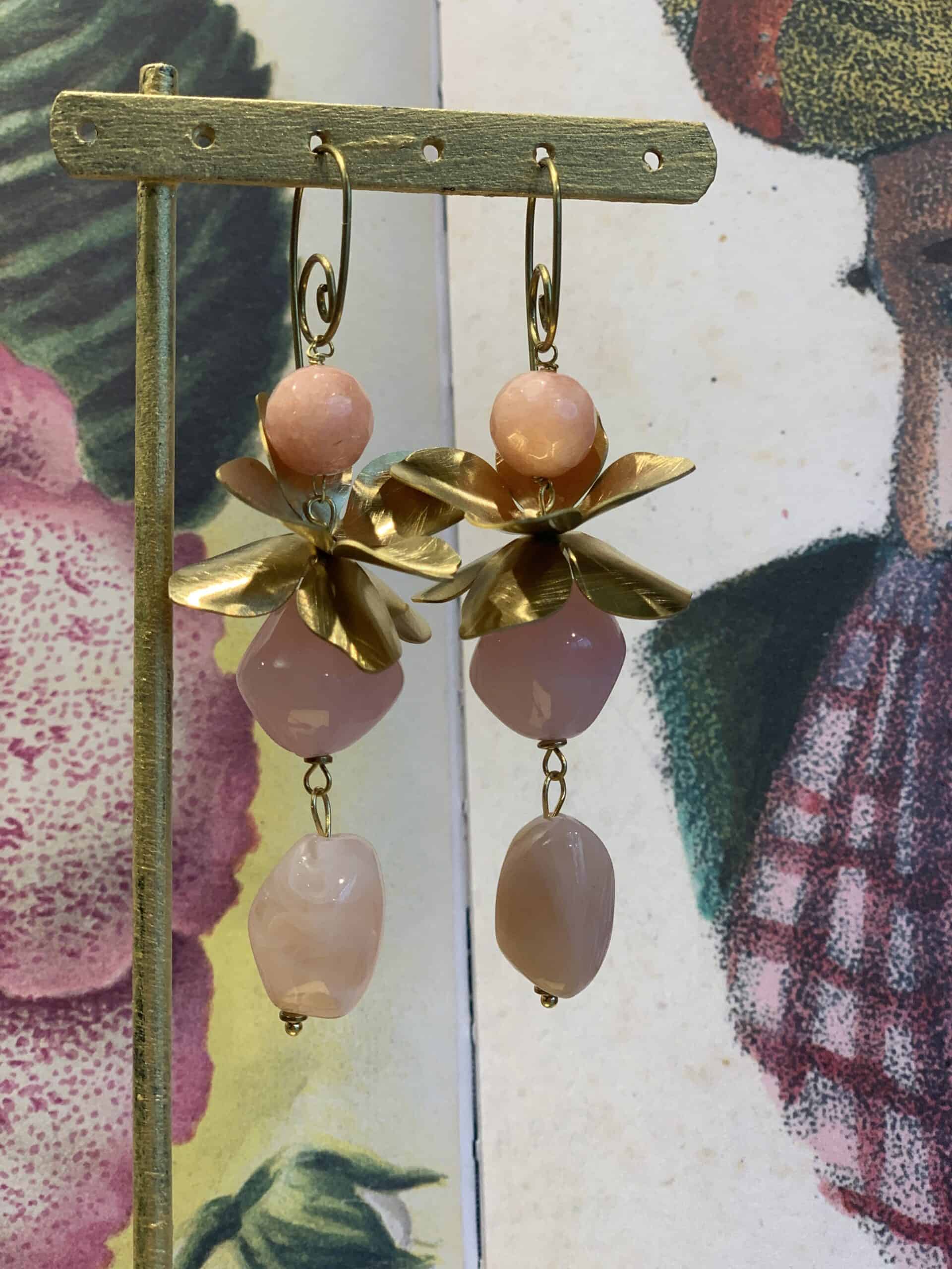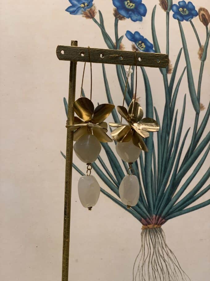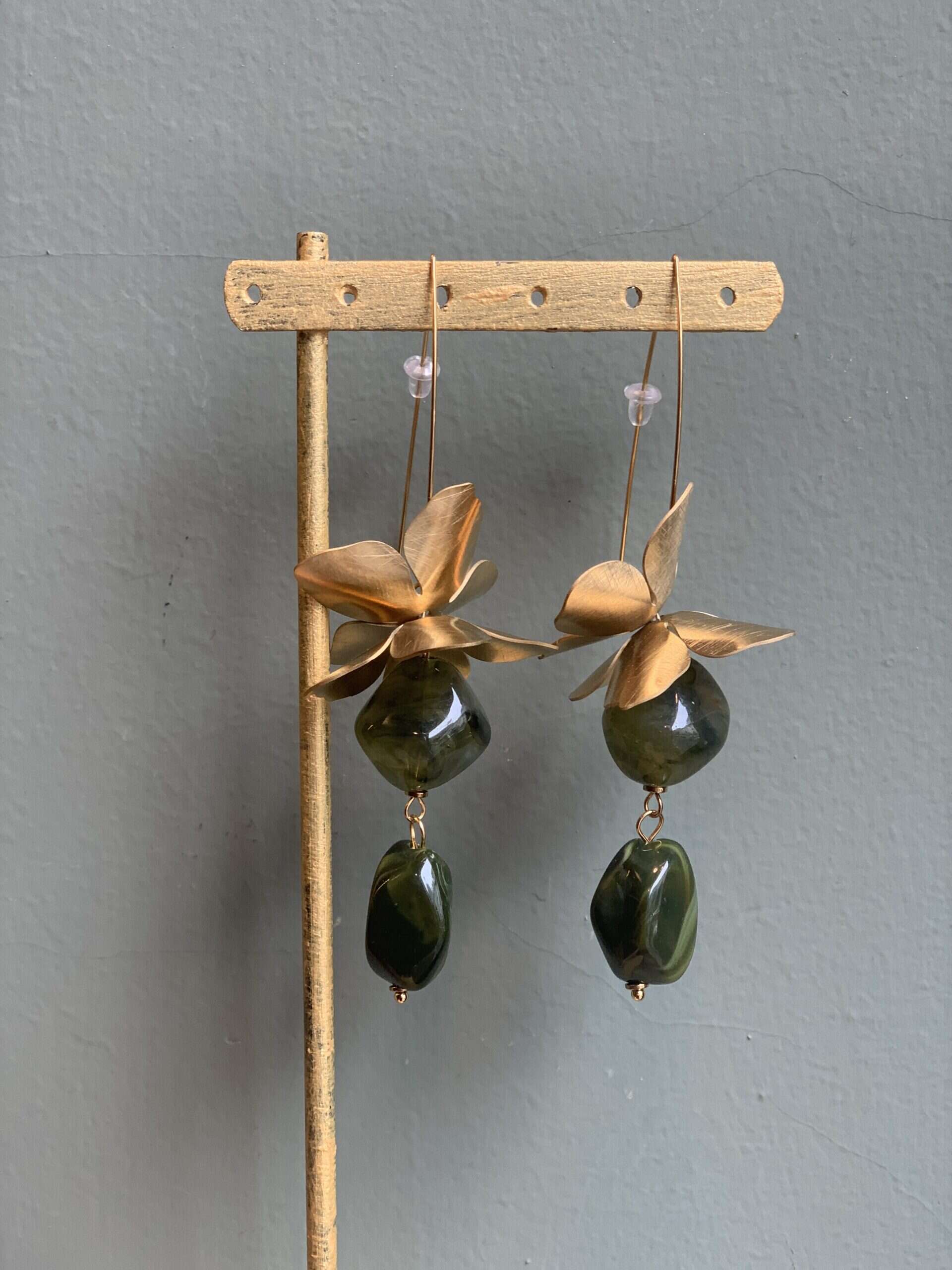 Orecchini lunghi con fiori in ottone e pietre in resina.