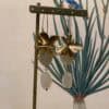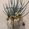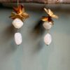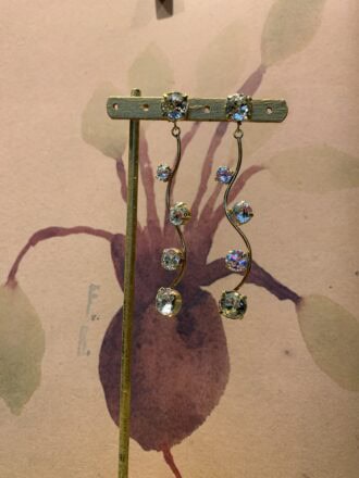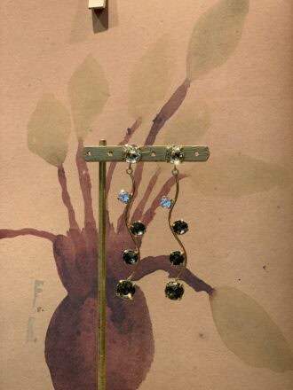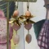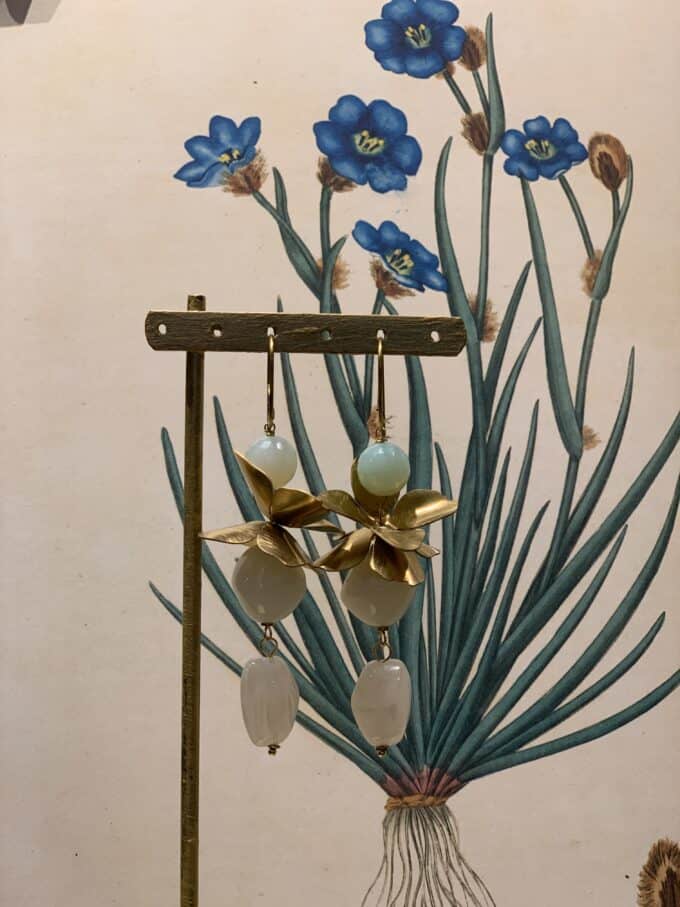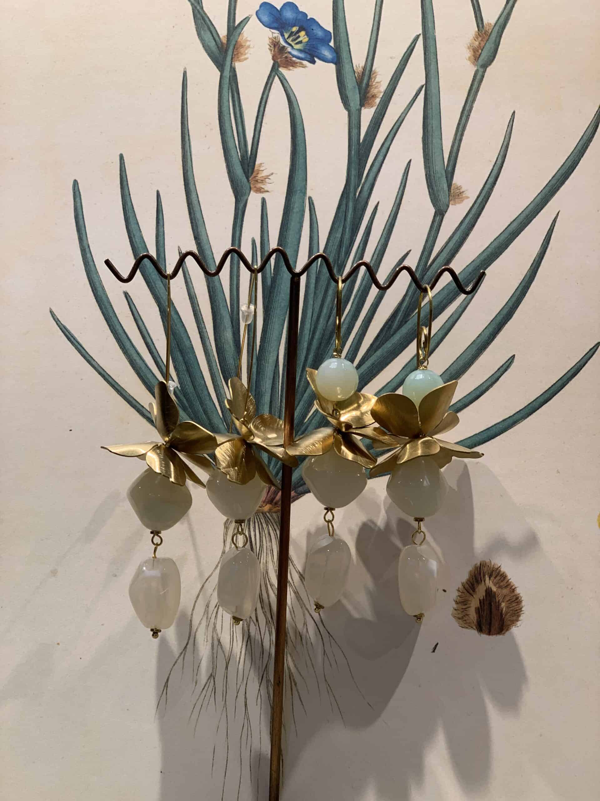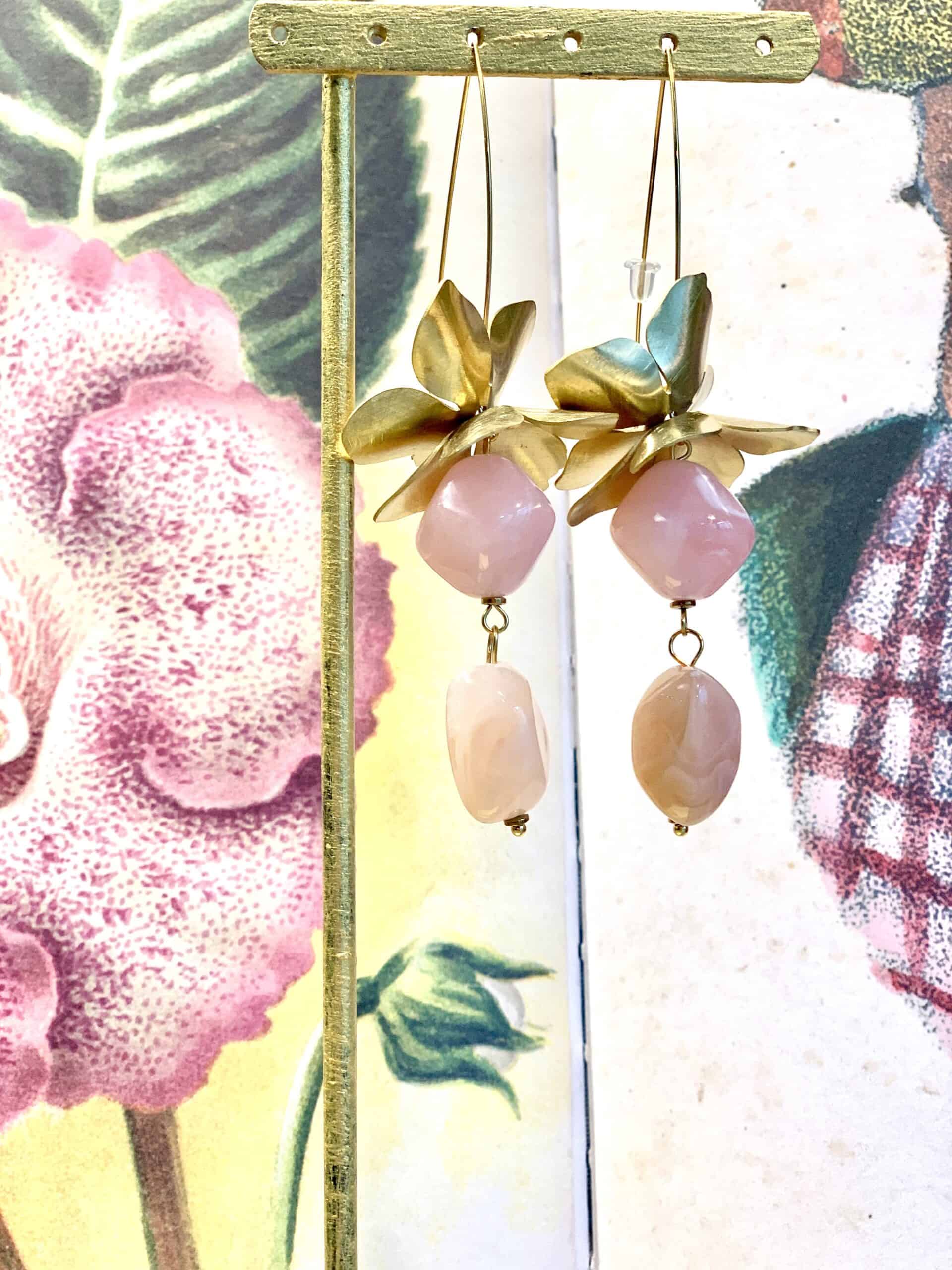 Orecchini lunghi con fiori in ottone e pietre in resina.