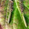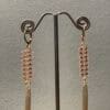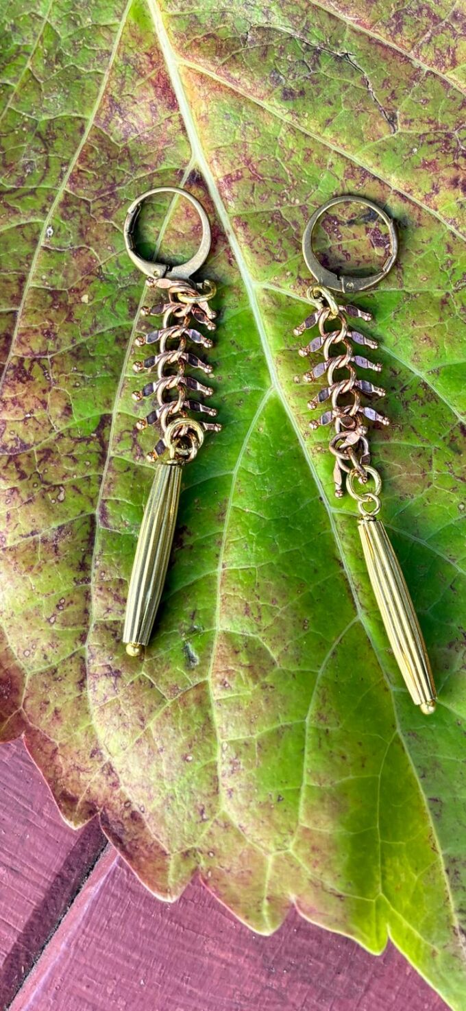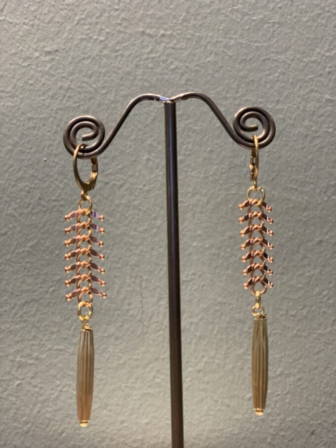 Orecchini con monachella francese, anallergica e senza nikel, catena in rame e barretta in ottone rigato. Si possono abbinare alla collana Pastisse.