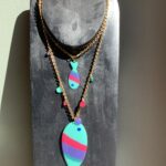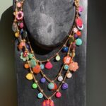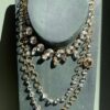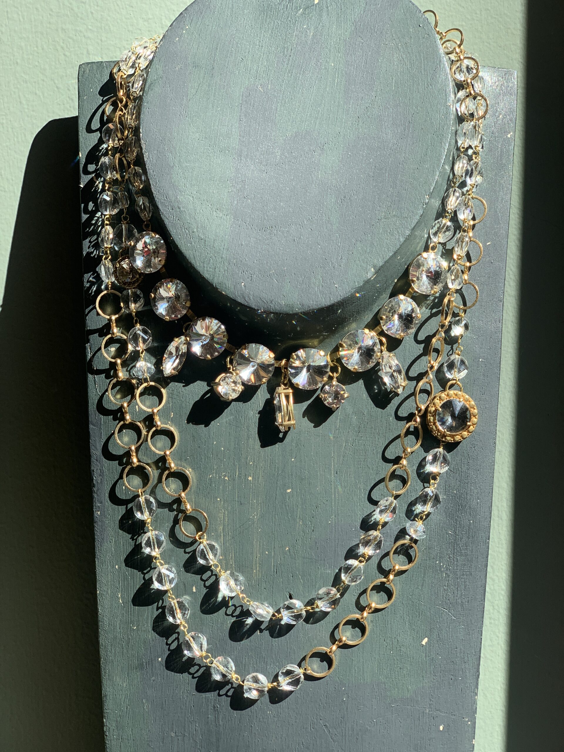 Collana lunga con catena in ottone bagnata in oro chiaro opaco, con cristalli color ghiaccio di diverse forme e grandezze.